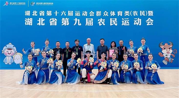 熱烈祝賀謝芳同志(照片中第一排從左到右第三位)在湖北省第十六屆運動會群眾類(農民)健身操團體比賽中獲得一枚金牌,四枚銀牌,團體總分第一的優異成績。